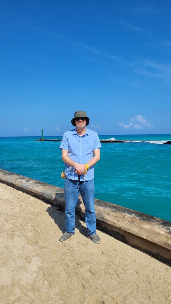 Lovely people. Read from Henri Miller’s Tropic of Capricorn, very funny scenes in this book so far, I’m reading it for the second time, how far he could go, writing about a slice of rye bread is extraordinary and very comical. Incredible people on the beach. Then I got up off the beach chair and back at the hotel I met the crew. Quick stop at the restau. for a pina colada for Sensei and we hit the road. Took a bus to Varadero, there we walked about the mouth of what I suppose was a river or an inner body of water, glorious blue water it had. I spoke to a piscator, he related to me that he could catch Barracuda and another kind of fish which I cannot remember the name now. We hit a restau. and I, being the only one hungry, ate two ham and cheese sandwiches, tipped in U.S. which is IT here in Cuba, and we caught the bus back. Many old U.S. beautiful cars!!!! Also, I saw a very happy almost nag like looking horse pulling a couple seats, the beast looked very content, trotting down the highway, the owner greeted him and I. Back at the hotel I sang some AC/DC, fixed a coffee, and wrote this recounting. Napped.