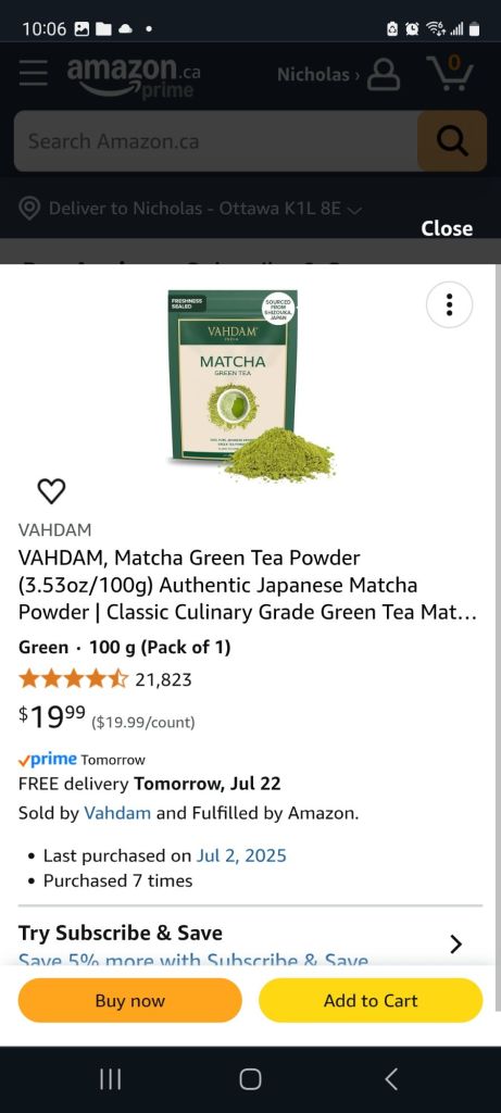 Ohhhhhh! Spread the word on les avantages of matcha tea! Mine was farmed on Cheju Island, REALLY GOOD TEA, But Amazon is out, so, Vahdam is just as good!!!🍵
